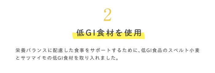 - 低GIのスペルト小麦とサツマイモを炭水化物源として使用