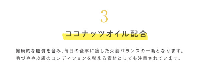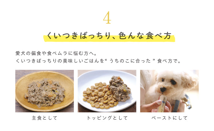 | 与え方 | 主食としてはもちろん、トッピングや固形物が食べにくい子の栄養補給としてお使いください。 |